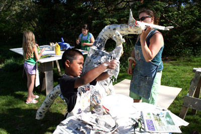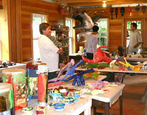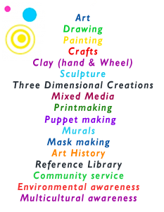 Painting:  We use many painting and drawing mediums, Watercolor, Tempera, Acrylic, Water Based Oil Paints, Pastels, Oil Pastels, Watercolor Crayons and Pencils and Colored Pencils etc.  The students learn about color, composition, dimension, shape, balance, movement, rhythm, overlapping, technique etc Ceramics: The students learn hand building techniques and Potters Wheel skills. Their imaginations are free to explore, discover and shape a wide variety of objects: nature, animals, people, imaginary and whimsical creatures and functional forms. Sculpture:   We have all kinds of materials for sculpture: Papier Mache’, Plaster Gauze, Clay, Wood, Foam Rubber, Found Objects, Cardboard, Paper and glue guns and craft decorations etc. Mask making and Puppets Printmaking:  SoWC has an Etching Press and we will use it to create various kinds of intaglio and relief prints according to age level and ability. Monotypes, Stencils, Collagraphs, Linoleum prints, Woodcuts etc. Library:  SoWC has an extensive library of books on the History of Art, Great Masters, Contemporary Artists, Animals, Nature, Boats, Buildings, Multicultural Art Projects, How to Guides, Reference Photos and lots more.